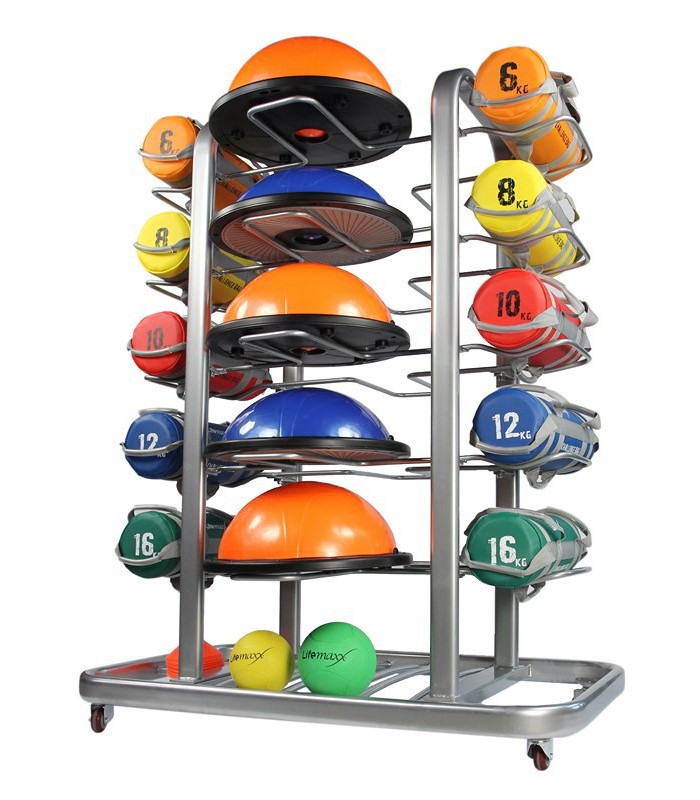 RACK POLIVALENTE COLORE ARGENTO CON RUOTE MULTI DIREZIONALE ADATTO PER 10 PALLE MEDICHE (LMX 1250), 10 CHALLENGE BAGS (LMX 1550), 10 BALANCE DOMES (LMX 1600) E CONI BASSI (LMX 1275), DIMENSIONE: L: 1450mm x W: 1150mm x H: 1930mm